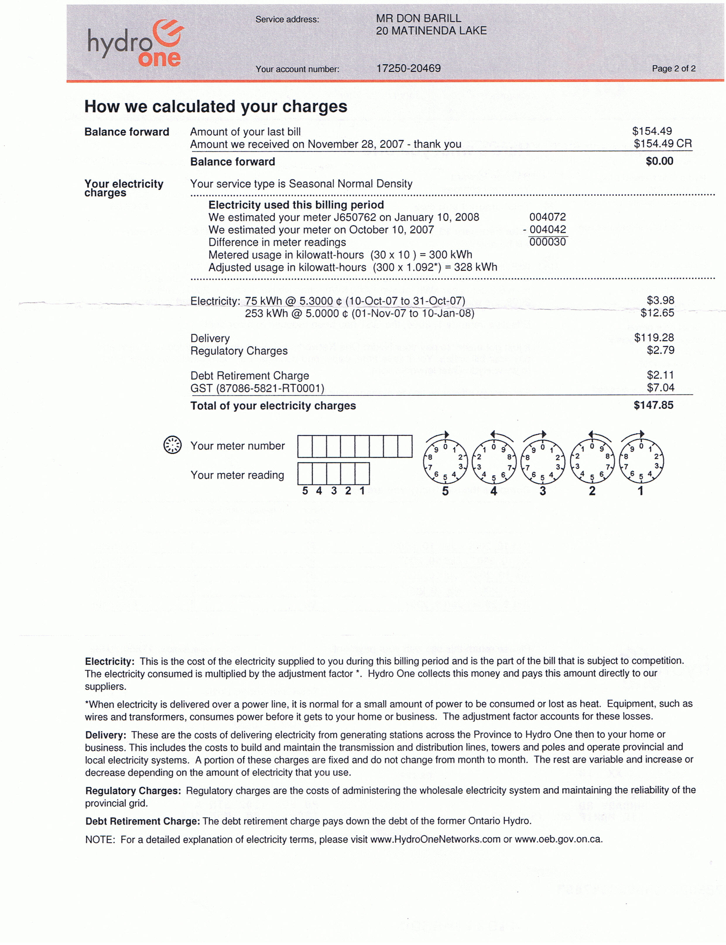 I have a family summer camp on Lake Matinenda, north of Blind River, Ont. I am attaching my latest bill for the three month period Nov.-2007 to Jan-2008 to illustrate my point. My total electricity charge is $16.63, while my delivery charge is $119.28 !